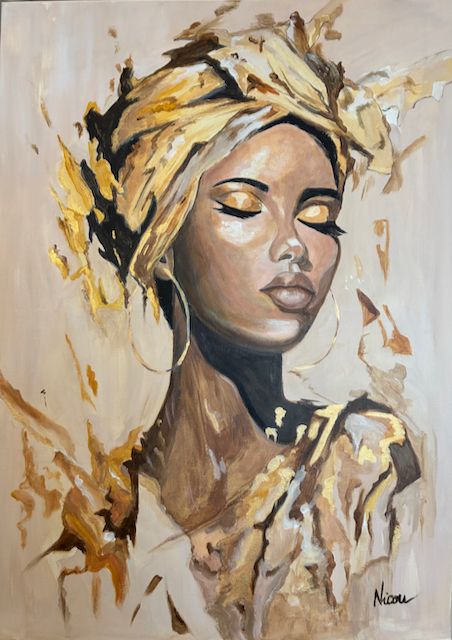 Portrait de femme les yeux fermés coiffée d’un turban et couverte de doré.