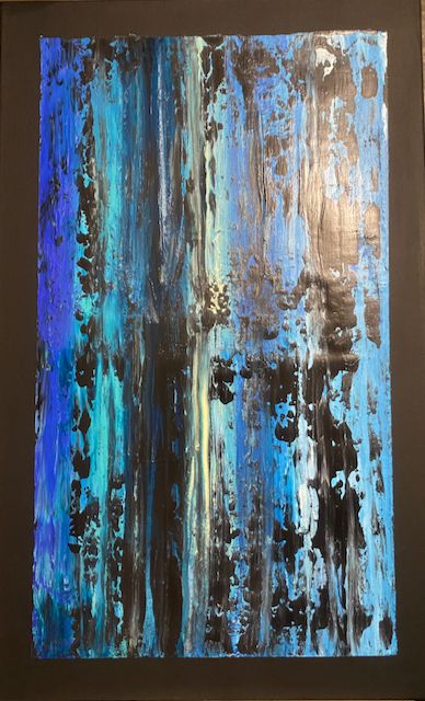 Peinture abstraite où déclinent des tons de bleu et de noir .